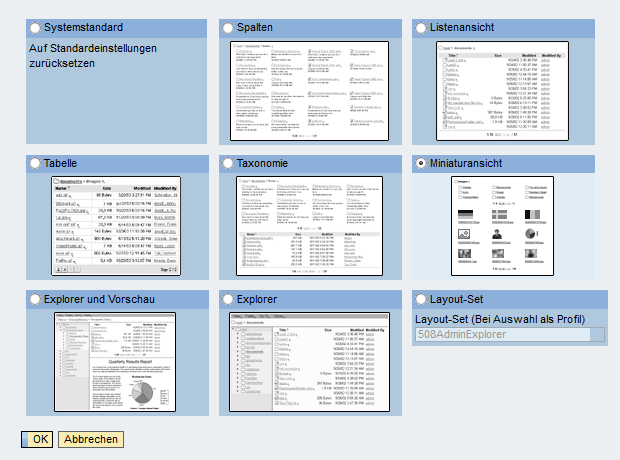 Nun kann die Darstellung entweder für den eigenen User oder für alle Benutzer umgestellt werden. Die Darstellungsoptionen werden angezeigt, sobald man auf “Profil auswählen” klickt. Dort wird in diesem Beispiel die Miniaturansicht ausgewählt.